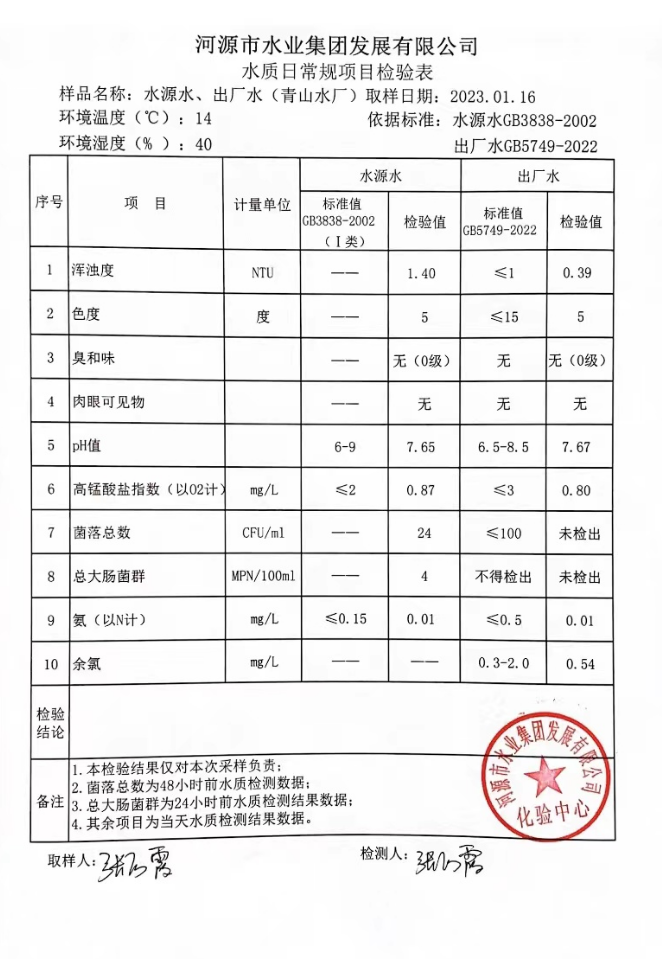 2023年1月16日水質(zhì)檢驗(yàn)報告