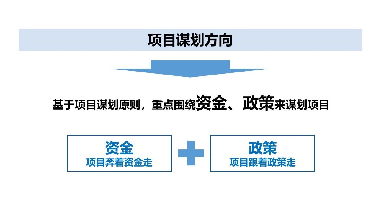 如果我們還是按照以前做項(xiàng)目的邏輯,那是很難獲得項(xiàng)目的資金支持。新形勢(shì)下,項(xiàng)目謀劃應(yīng)該謀什么?彭總提出兩大項(xiàng)目謀劃方向,即項(xiàng)目奔著資金走和項(xiàng)目跟著政策走。