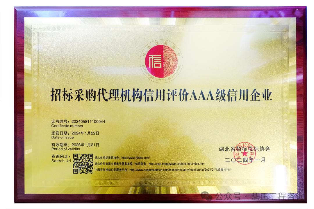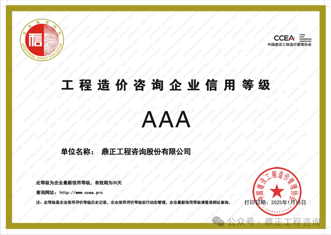 近日,中國工程咨詢協會發(fā)布了2024年度工程咨詢單位信用評價公告,鼎正憑借優(yōu)異的誠信建設和信用管理能力,榮獲“AAA級信用等級”評價。