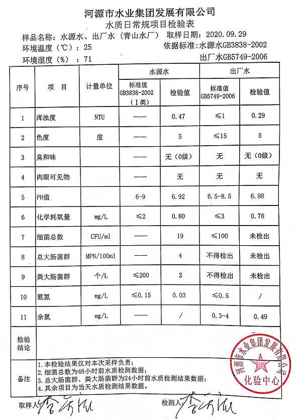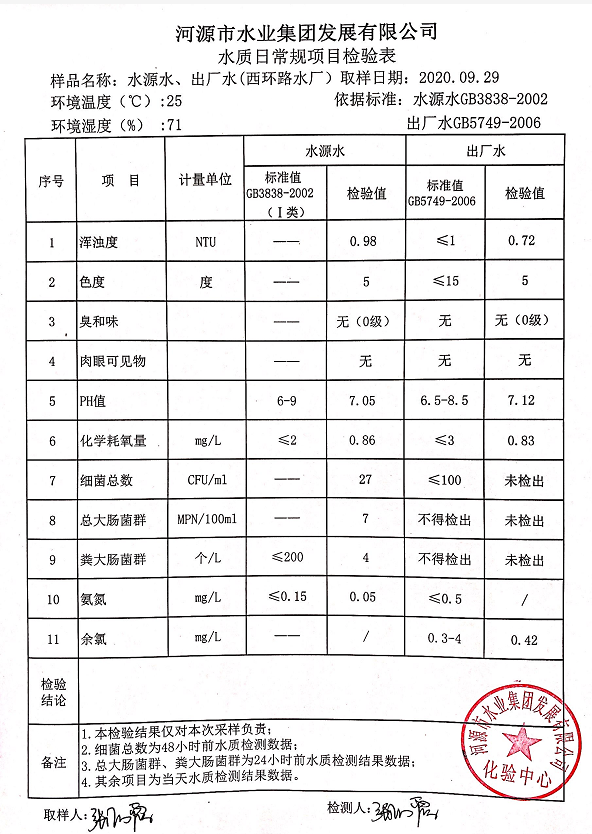 2020年9月29日水質(zhì)檢驗(yàn)報(bào)告