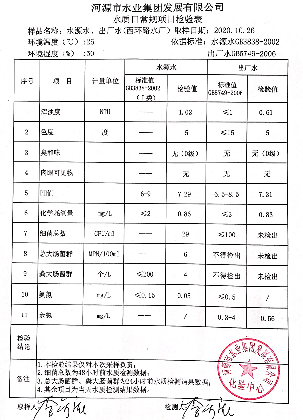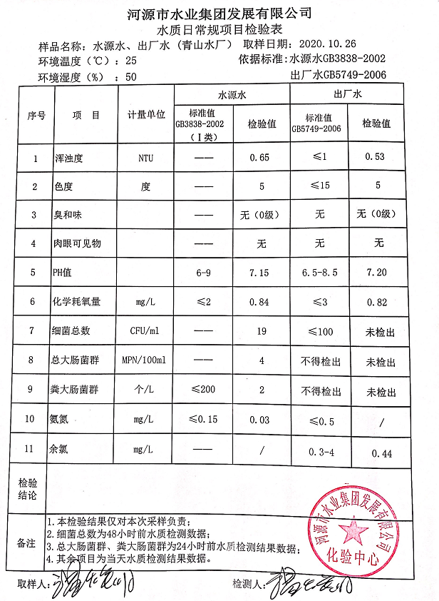 2020年10月26日水質(zhì)檢驗報告