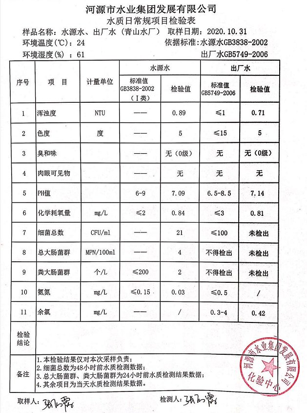 2020年10月31日水質(zhì)檢驗報告