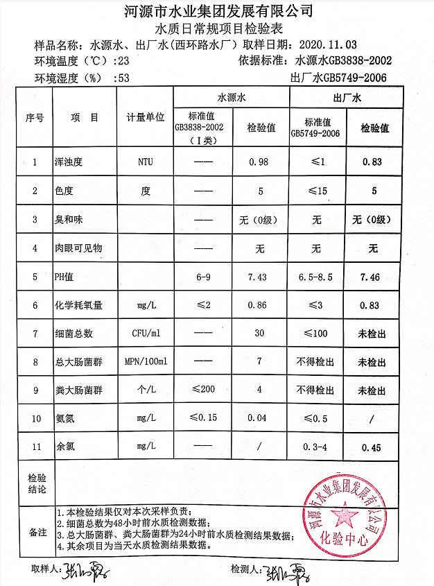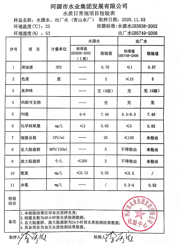 2020年11月3日水質(zhì)檢驗報告