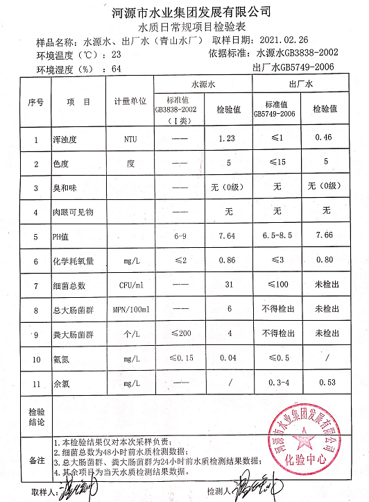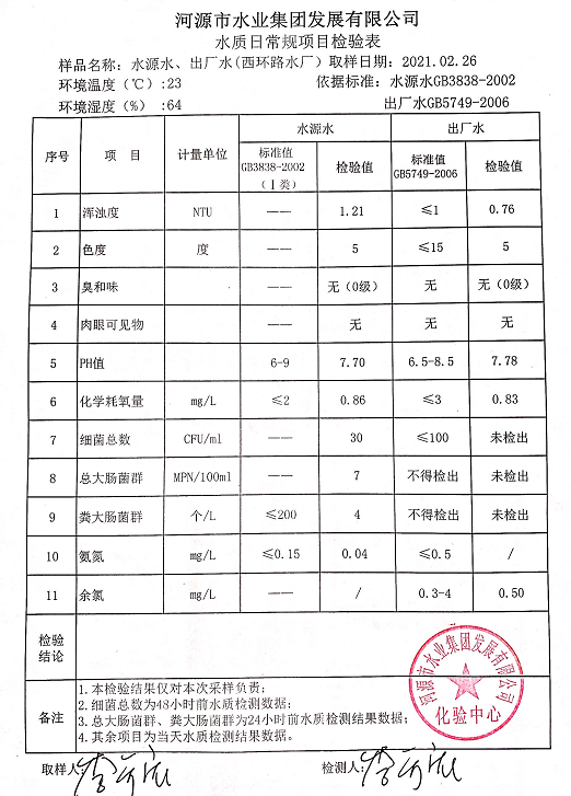 2021年2月26日水質(zhì)檢驗報告