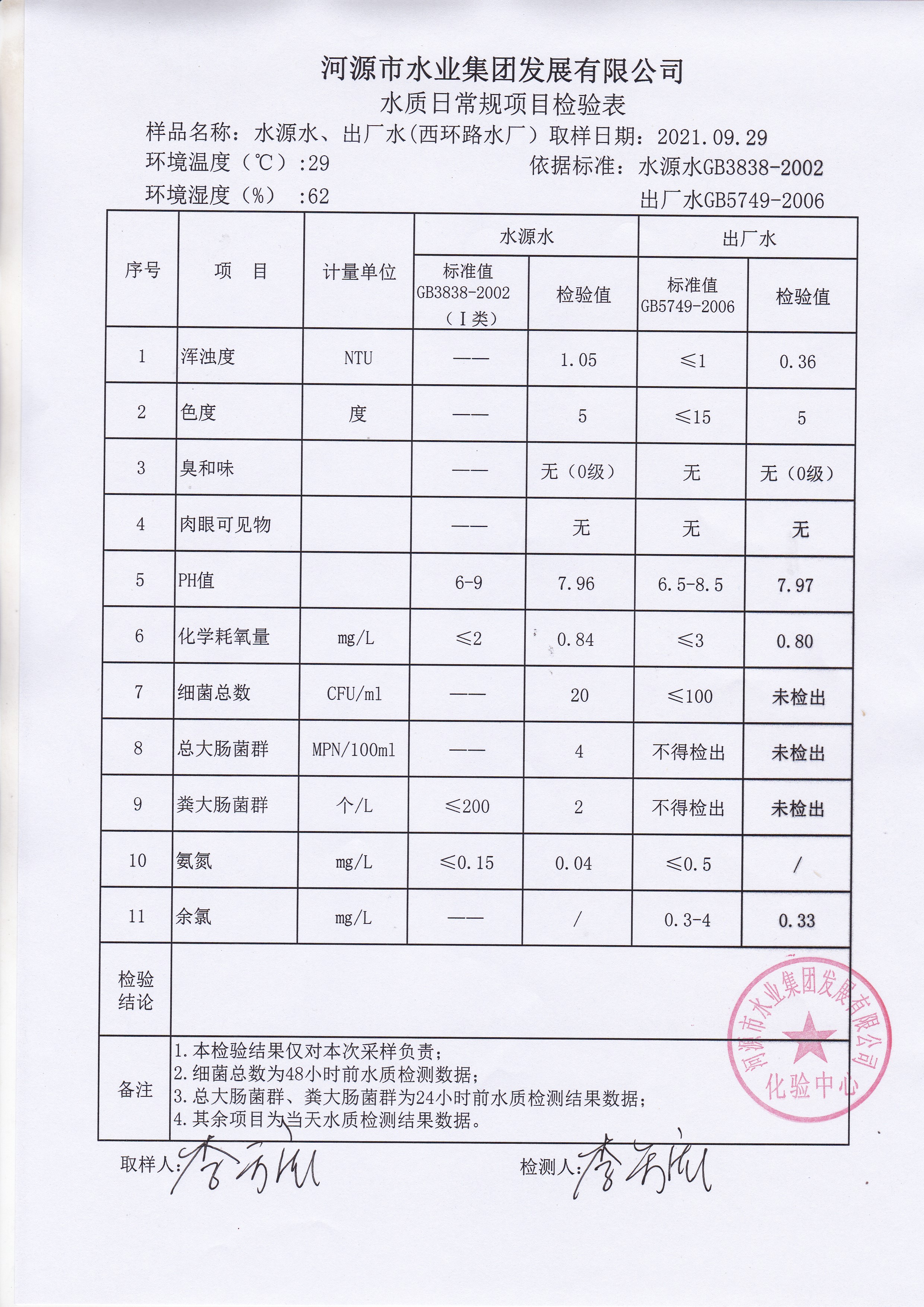 2021年9月29日水質(zhì)檢驗(yàn)報(bào)告