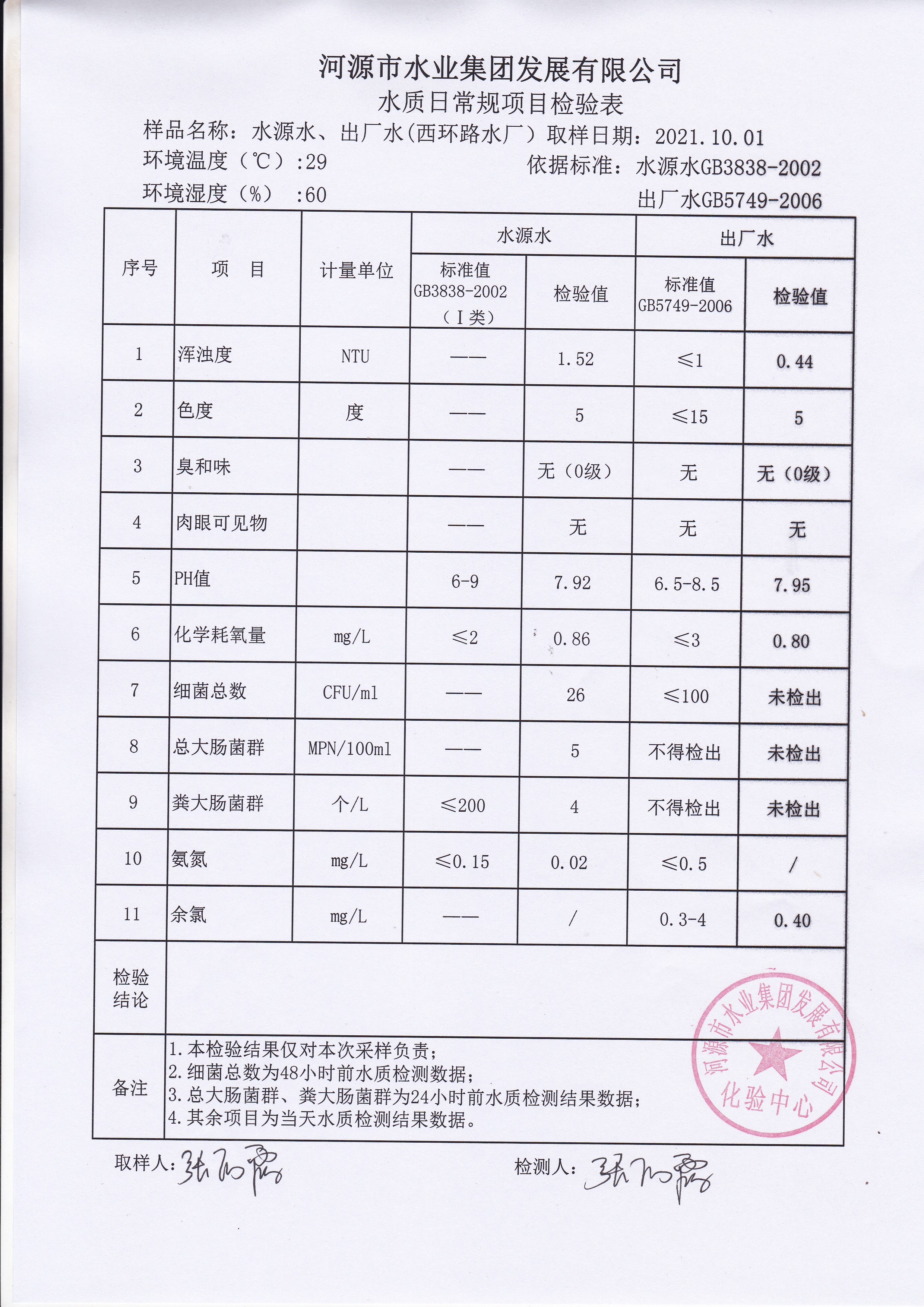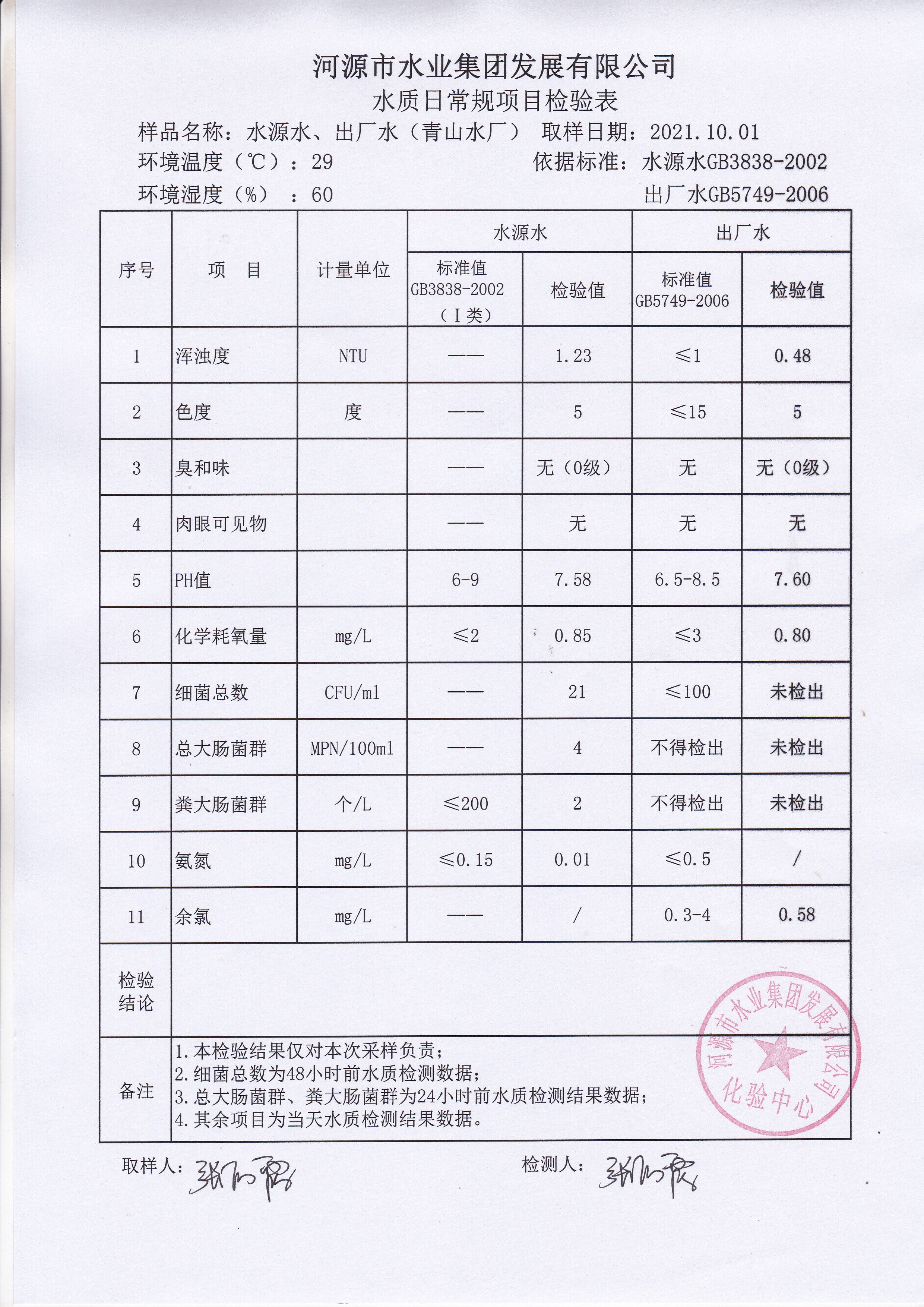 2021年10月1日水質(zhì)檢驗報告