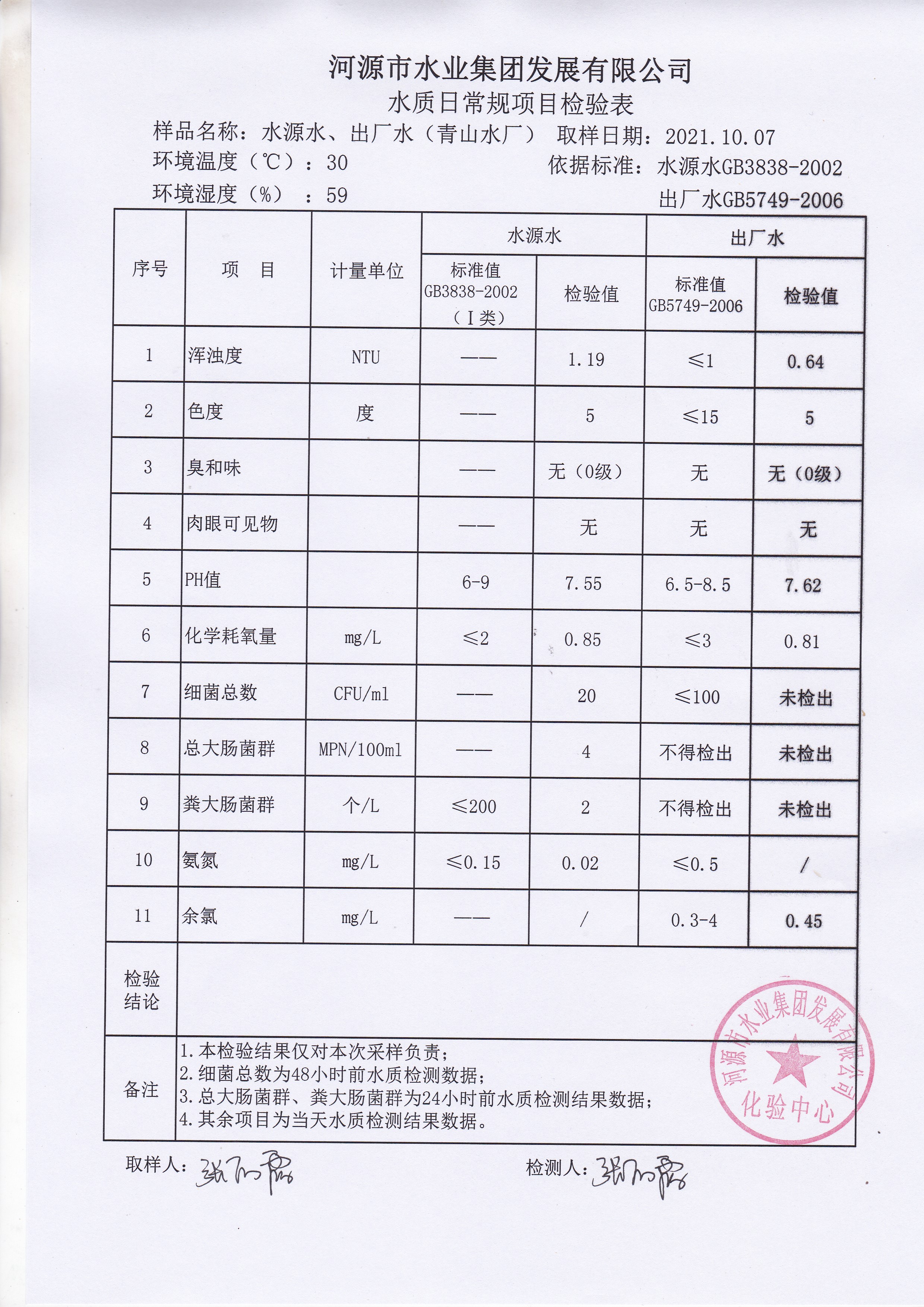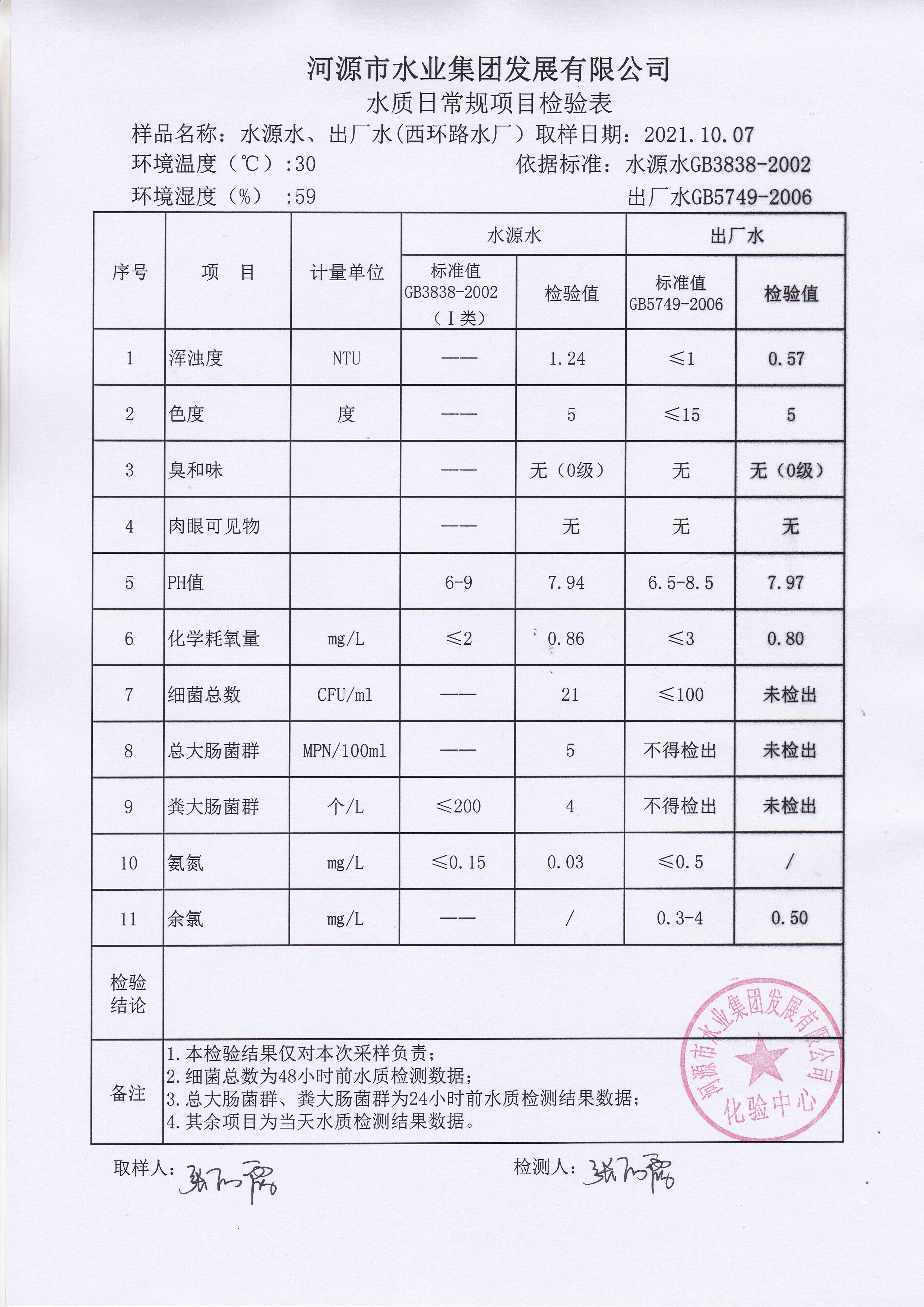 2021年10月7日水質檢驗報告