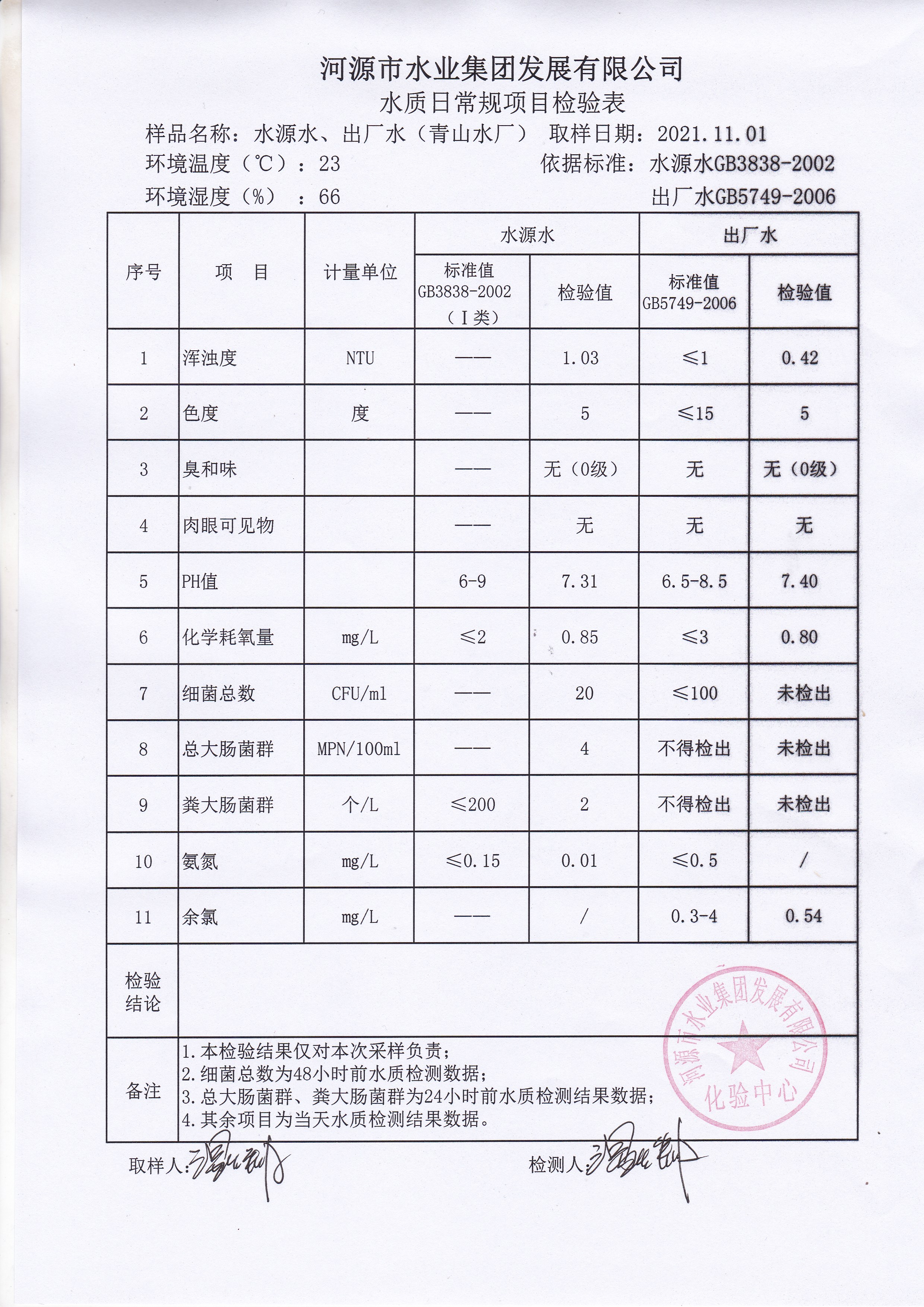 2021年11月1日水質(zhì)檢驗(yàn)報(bào)告