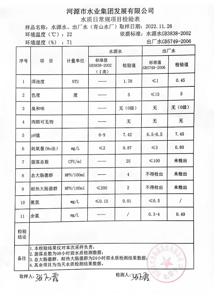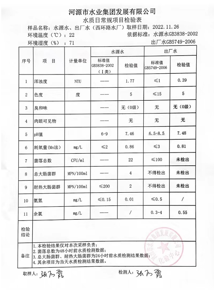 2022年11月26日水質(zhì)檢驗報告