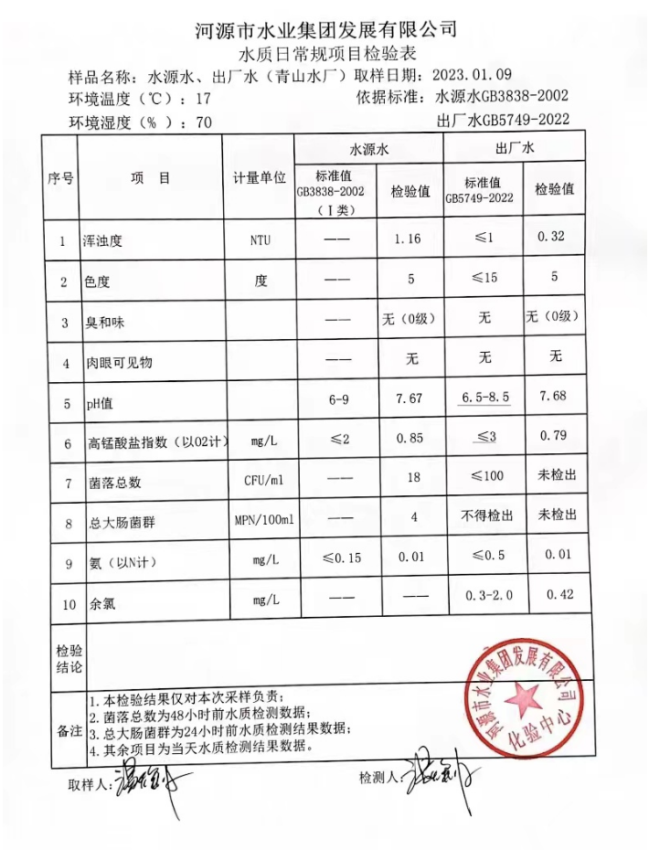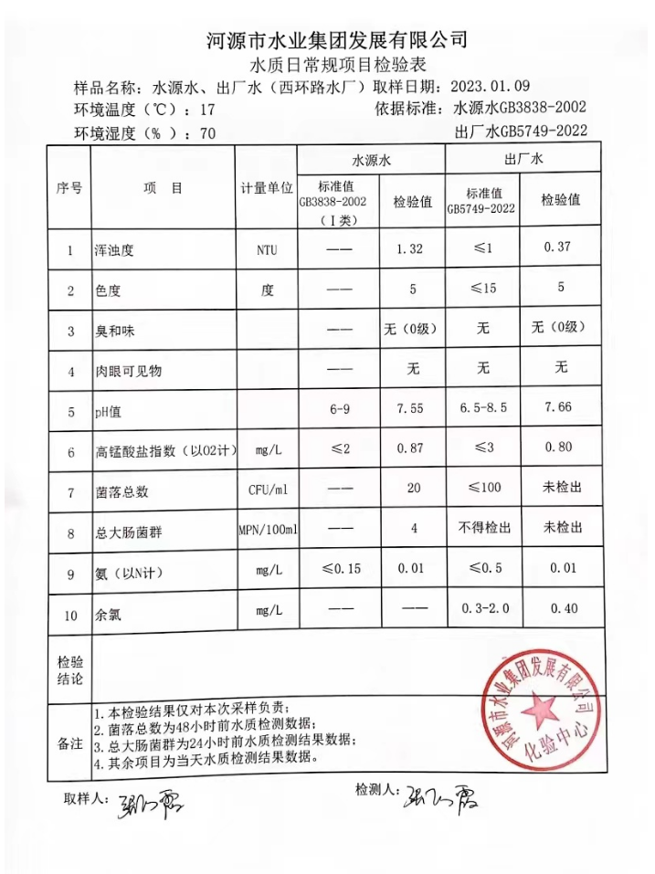 2023年1月9日水質(zhì)檢驗(yàn)報(bào)告