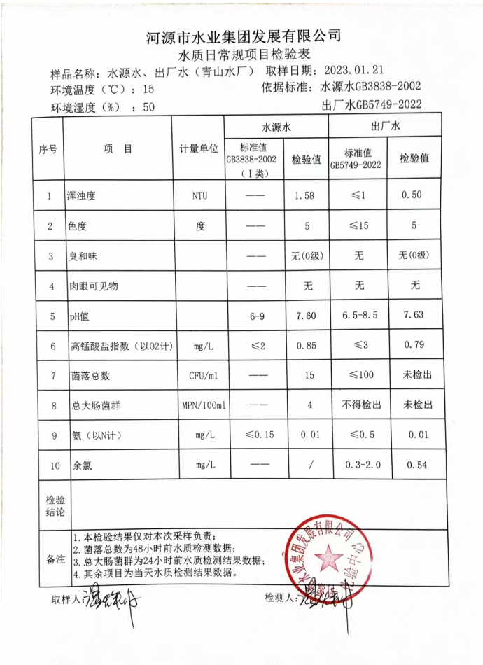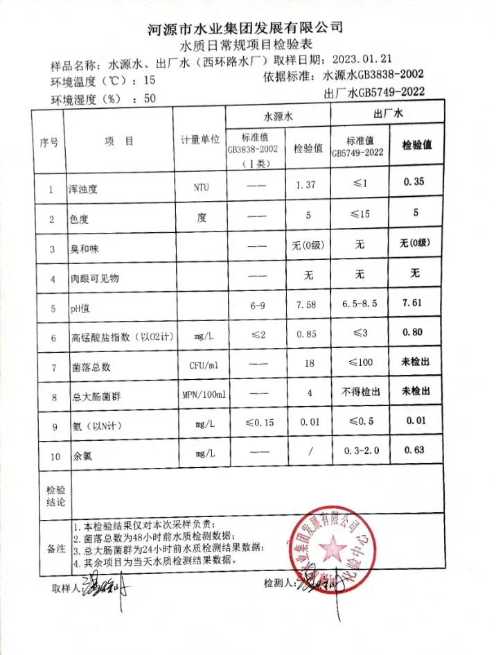 2023年1月21日水質(zhì)檢驗(yàn)報(bào)告