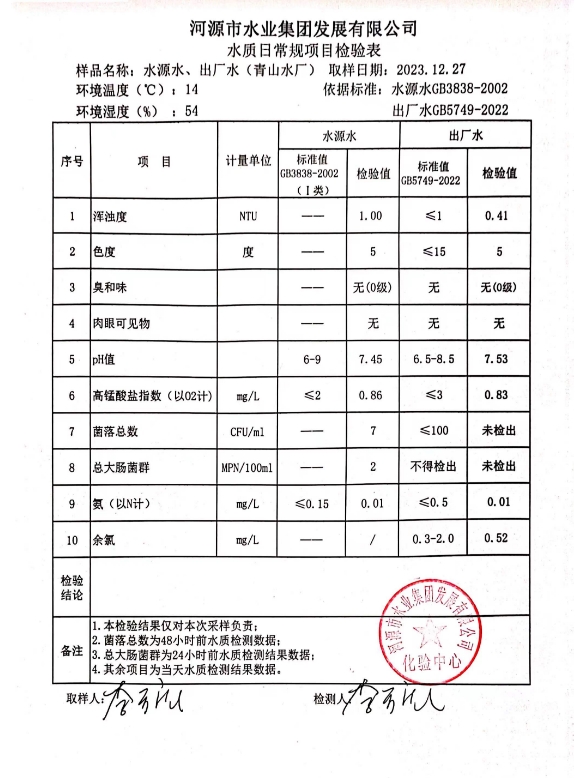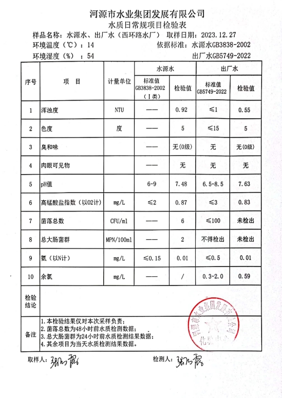 2023年12月27日水質(zhì)檢驗(yàn)報(bào)告