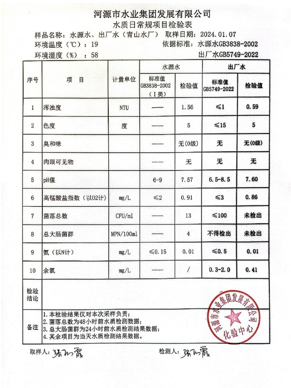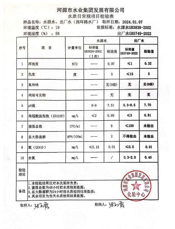 2024年1月7日水質(zhì)檢驗報告