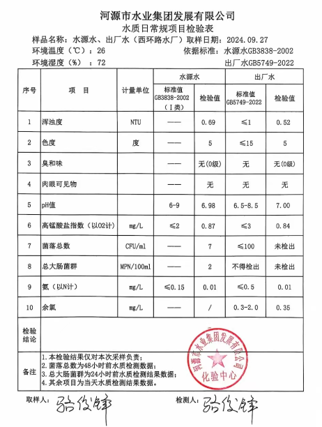 2024年9月27日水質(zhì)檢驗(yàn)報(bào)告