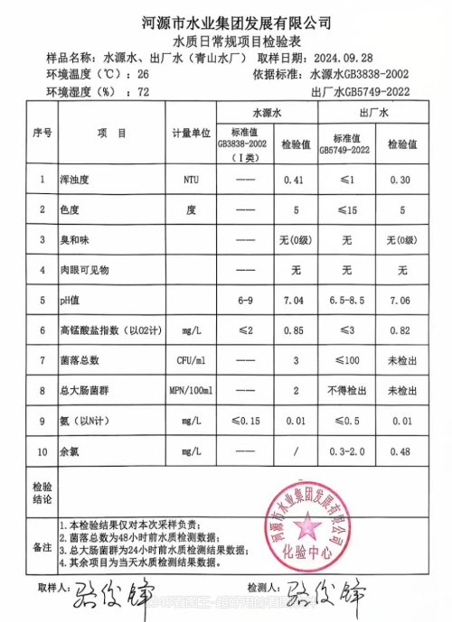 2024年9月28日水質(zhì)檢驗報告